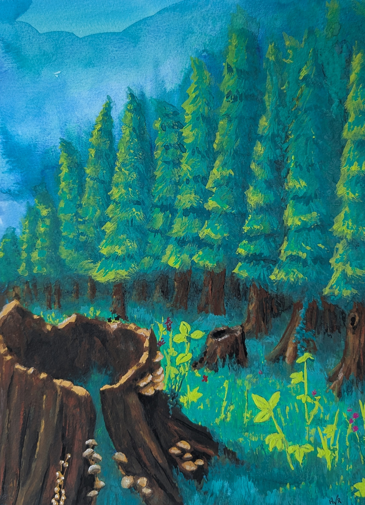 Gouache is a thicker pigment that allows colors from the background to barely peer through. The depth you can create in a piece through the use of layers and colors make it a favorite of mine.